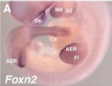 Figure 2A. Copyright: Reprinted with permission from Elsevier from [doi:10.1016/S0925-4773(02)00220-4] Mech Dev 118: 161, Tribioli C; Robledo R; Lufkin T, The murine fork head gene Foxn2 is expressed in craniofacial, limb, CNS and somitic tissues during embryogenesis. Copyright 2002.