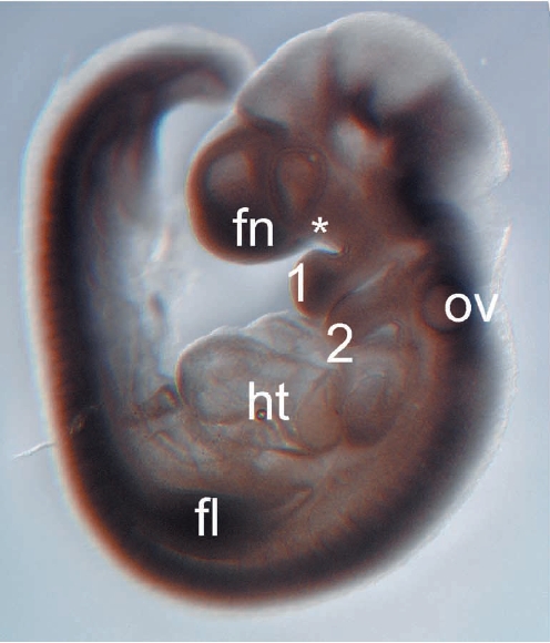 Fig1(E9.5) of [doi:10.1038/85855] Guris DL; Fantes J; Tara D; Druker BJ; Imamoto A. 2001. Nat Genet 27(3): 293-8. Mice lacking the homologue of the human 22q11.2 gene CRKL phenocopy neurocristopathies of DiGeorge syndrome. [PMID:11242111] © Nature Publishing Group. Reproduced with permission from Nat Genet.
